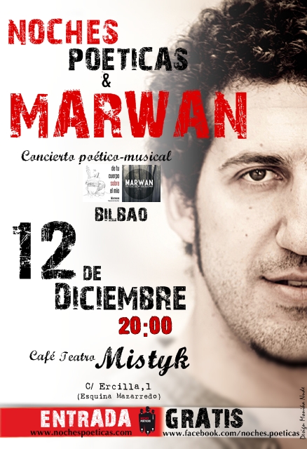 Y a las 20:00 horas el Café Teatro Mistyk de Bilbao acogerá una nueva velada de las ya tradicionales Noches Poéticas. Además del equipo poético habitual (Julián Borao, Javier Arnaiz, Monika Nude, Asier Triguero, Julio G. Alonso, Alberto Arzua y Ritxi Poo ) y sus seguidores que compartirán escenario entre los que stá nuestro socio Santiago Liberal, esta noche contará con la presencia del cantautor local Jon Arraibi y del cantante Marwan.