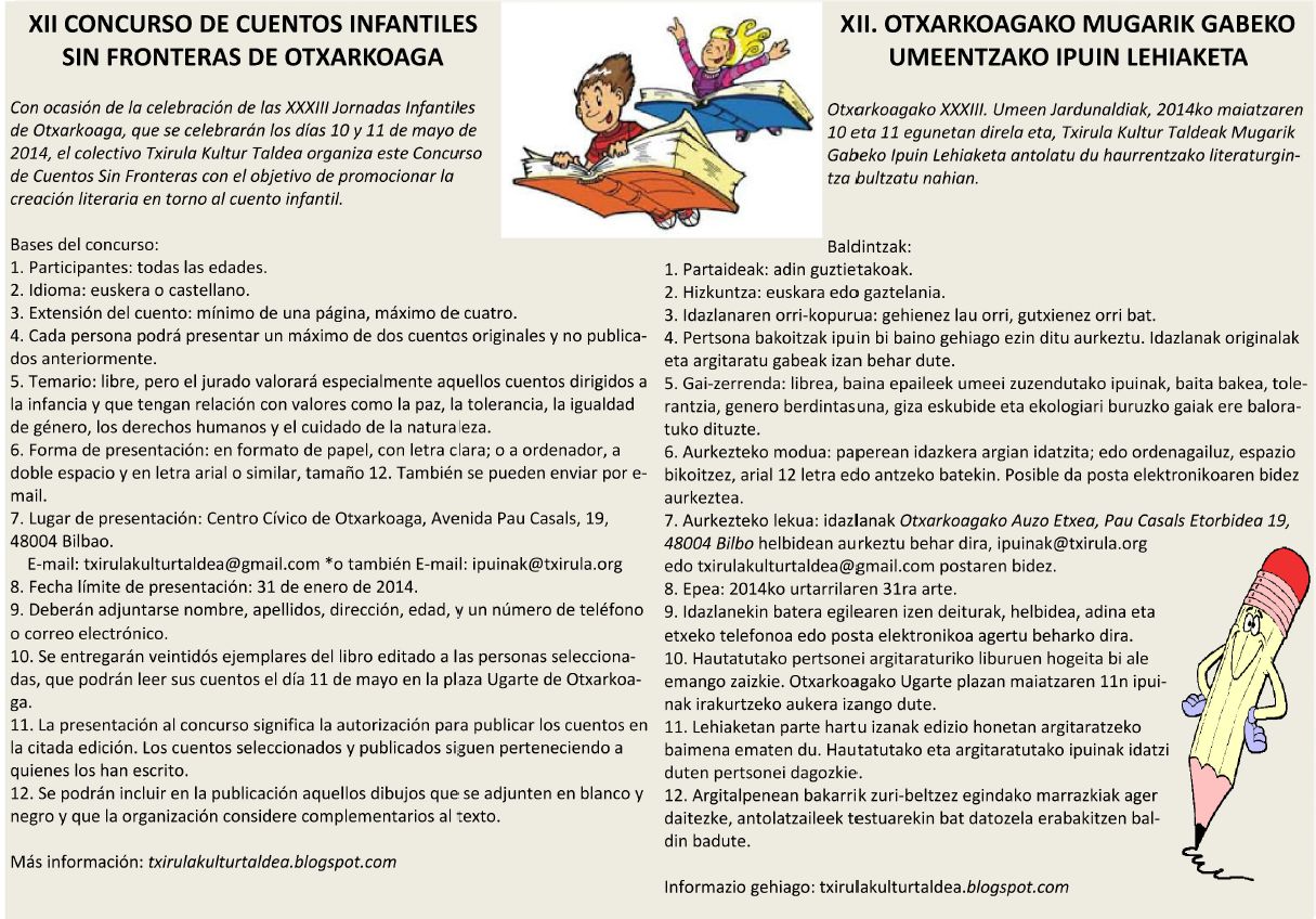 2-Lanak, gai librekoak, ez dira A-4 formatua (297x210 milimetroak) baino handiagoa izan behar, ezta 300 pixelak hazbeteko baino gehiago ere. Posta elektronikoz bidali behar izango dira helbide honetara: Esta dirección de correo electrónico está siendo protegida contra los robots de spam. Necesita tener JavaScript habilitado para poder verlo.. Mezuan poemaren izenburua baino ez da azaldu behar. Egilearen datu pertsonalak erantsitako Word dokumentu batean izan behar dira, lanaren izenburua agertuko delarik.