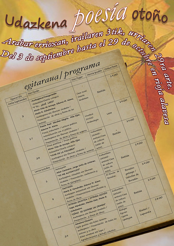 Organizadas por Edurne M. Aiona, una vez a la semana, y coincidiendo con el sábado, autores y autoras alaveses/as van a participar en unas jornadas literarias (Hitzak-Palabras) que tendrán como marco Leza, Labastida, Laguardia y Salinillas de Buradón.