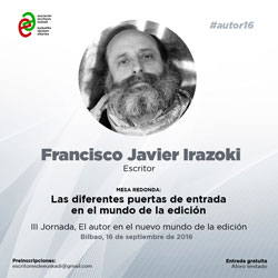 La Asociación de Escritores de Euskadi-Euskadiko Idazleen Elkartea (AEE/EIE) continúa anunciando nuevos nombres de ponentes y conferenciantes en la III Jornada 'El autor en el nuevo mundo de la edición', que se celebrará el próximo 16 de septiembre en Bilbao. El escritor y poeta Francisco Javier Irazoki estará en Azkuna Zentroa-La Alhóndiga para contribuir al debate con su experiencia como autor lírico en esta época de transformación tecnológica y cultural.