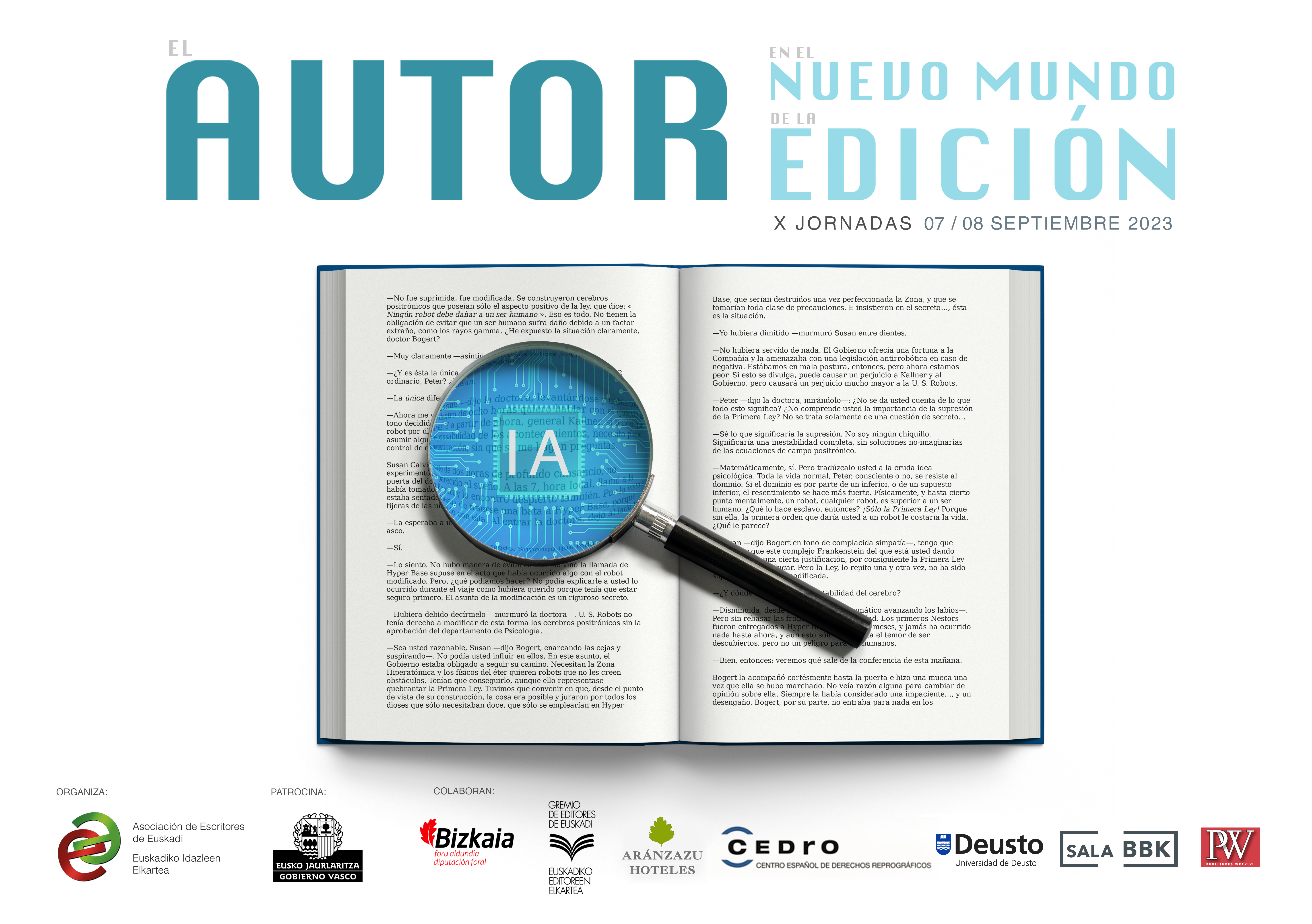 Las X Jornadas del Autor se han desarrollado en Bilbao durante los días 7 y 8 de septiembre, organizada por la Asociación de Escritores de Euskadi/Euskadiko Idazleen Elkartea (AEE/EIE) con el apoyo del Departamento de Cultura del Gobierno Vasco y con la colaboración de la Biblioteca Foral de Bizkaia, Sala BBK, Universidad de Deusto, del Gremio de Editores de Euskadi y de Cedro.
