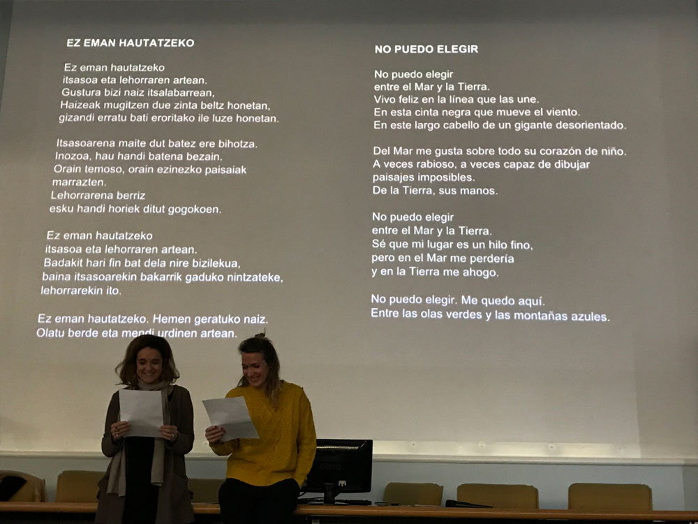 Las dos conferencias se han realizado con la ayuda y colaboración de la guía turística Elena Pérez (North Incoming Service) y el Departamento de Turismo del Gobierno Vasco, "que nos ha envíado folletos turístico que regalamos al final de una conferencia en la que también leímos una poesia de Kirmen Uribe a dos voces, en euskera y castellano", apunta Arruti.