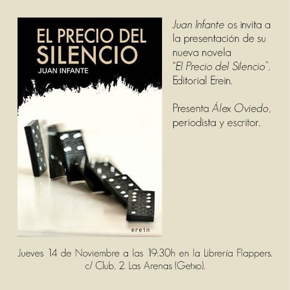 El próximo jueves 14 de noviembre, a las 19:30 horas, Juan Infante presentará su última novela El precio del silencio, publicada por la editorial Erein en su colección 'Cosecha roja' de novela negra.