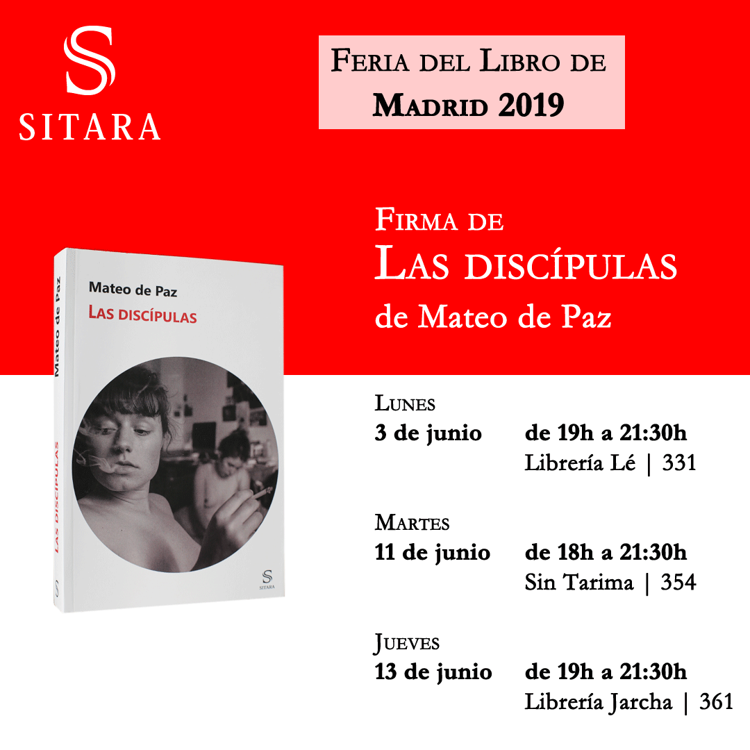 En el transcurso de la Feria del Libro de Madrid, que en su 78 edición se desarrolla del 31 de mayo al 16 de junio, el escritor Mateo de Paz participará firmando ejemplares de su primera novela Las discípulas (Sitara, 2018). Se encontrará con sus lectores en las casetas de la Librería Lé, donde presentó esta novela en compañía de Edurne Portela; Sin tarima y Librería Jarcha.