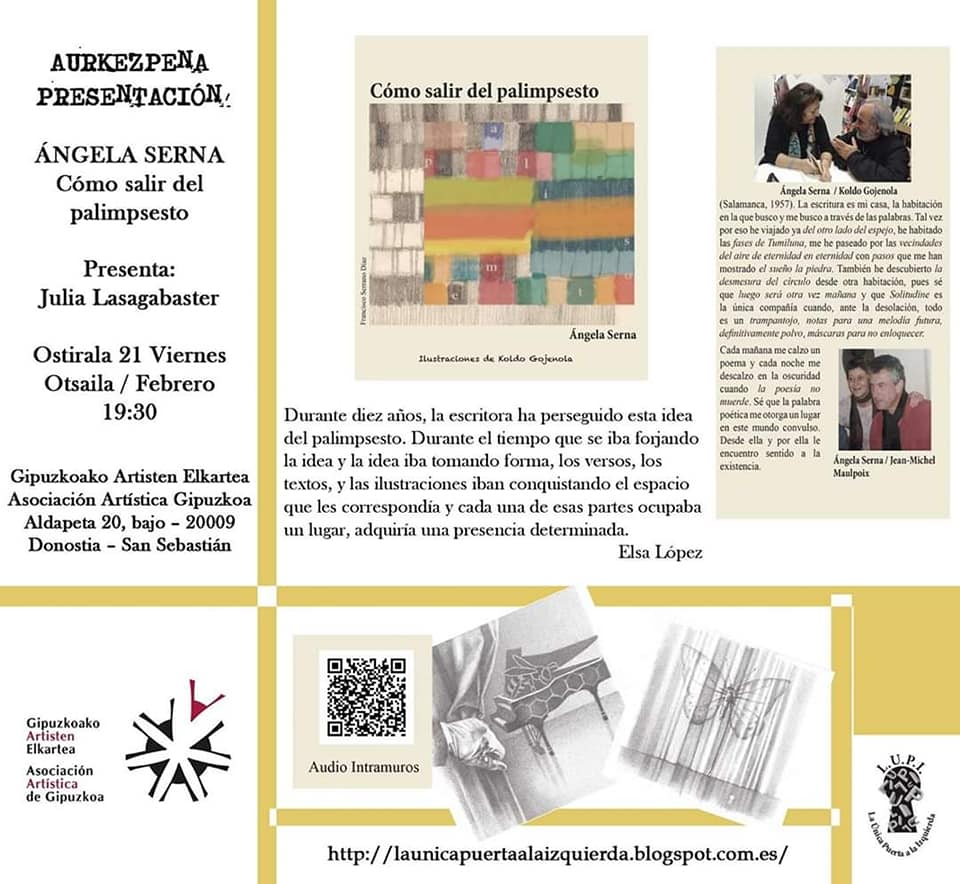 Ángela Serna (Salamanca,1957) presenta el próximo viernes 21 de febrero su último trabajo poético en la Asociación Artística Guipuzkoa (Aldapeta 20, Donostia - San Sebastián). La escritora estará acompañada de Julia Lasagabaster.