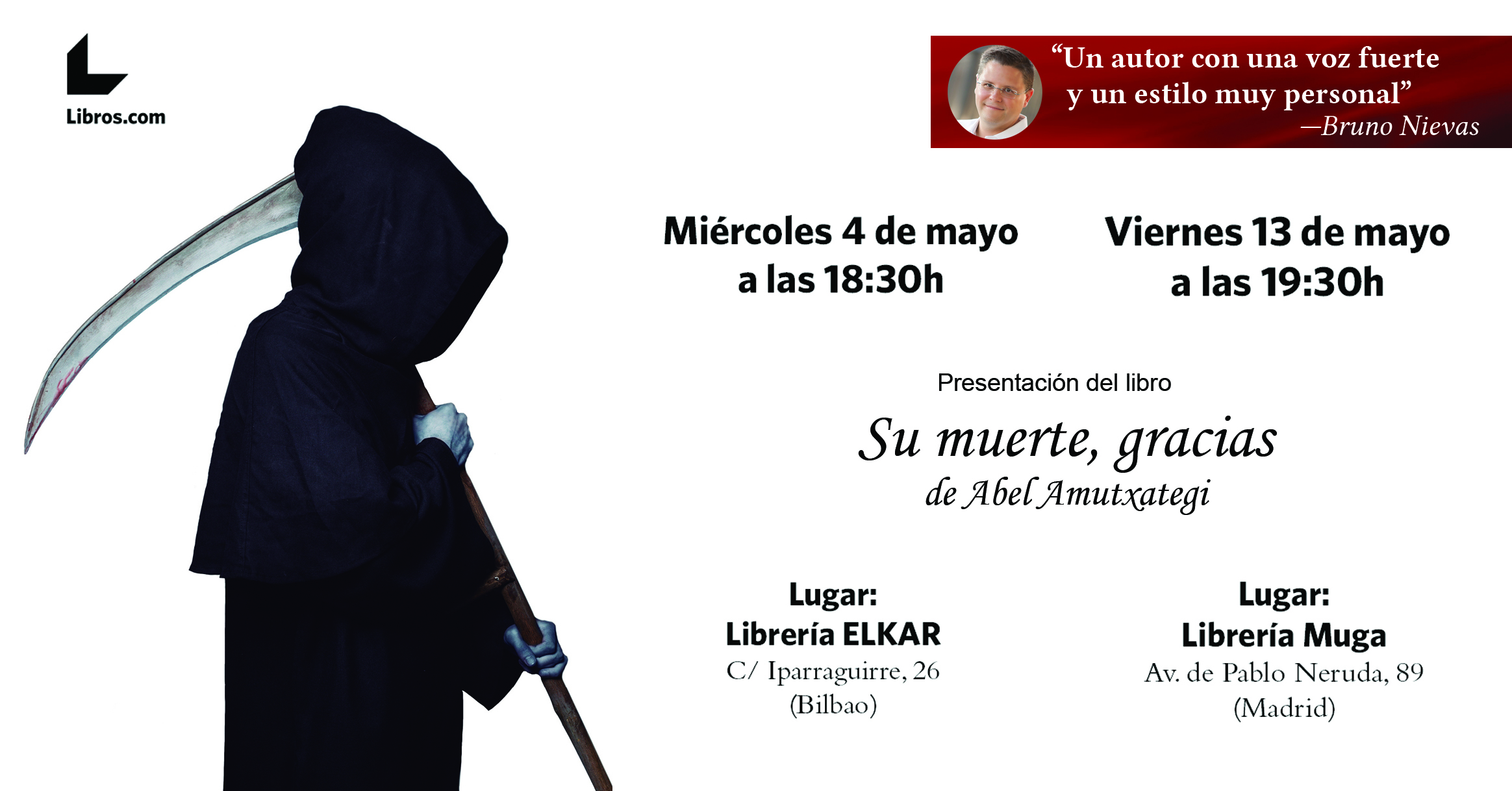 Abel Amutxategi presenta su novela 'Su muerte, gracias' en Bilbao y Madrid este mes de mayo