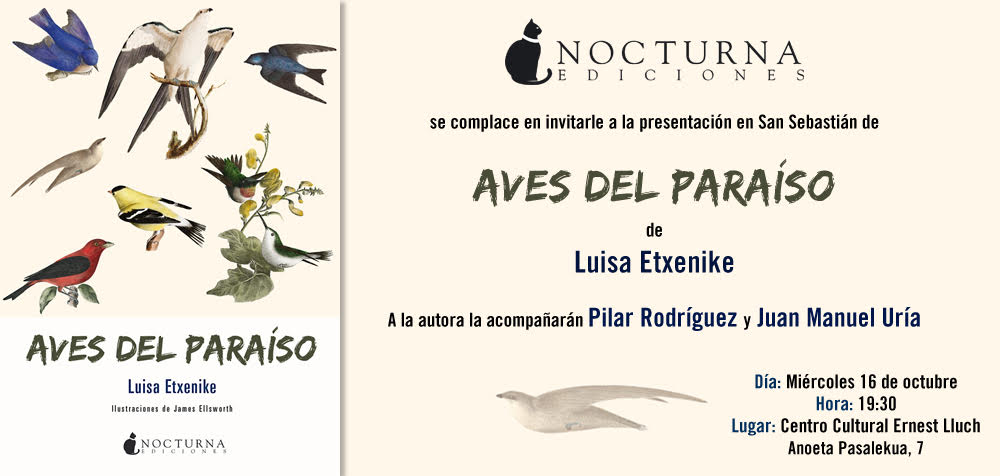 Datorren asteazkenean, urriak 16, Luisa Etxenikek Aves del paraíso (Nocturna Ediciones) bere azken eleberria aurkeztuko du Donostiako Ernest Lluch Kultura Zentroan 19:30etan. Pilar Rodríguez eta Juan Manuel Uría gure kideak ere egongo dira berarekin.